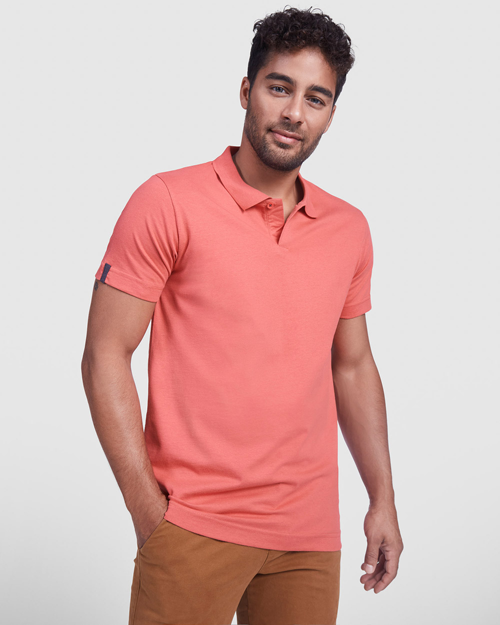 Polo de manga corta en tejido punto liso. Cuello y ribete de mangas en canalé 1×1. Tapeta con 1 botón. Cubrecosturas reforzado en cuello. Aperturas laterales en el bajo. Detalle de cinta en forma de espiga a contraste de color en puños y cuello. Logo Relieve Roly a tono de la base del tejido.