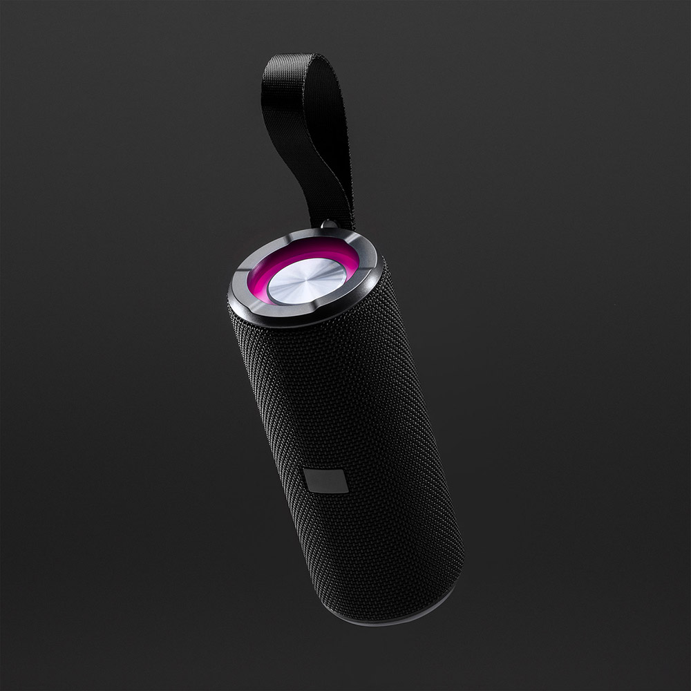 Altavoz inalámbrico de diseño con acabado tejido premium y potencia de 10W. Membrana transparente con 6 modos de luz led. Incluye resistente asa de transporte y placa especial para marcaje láser. Batería recargable.