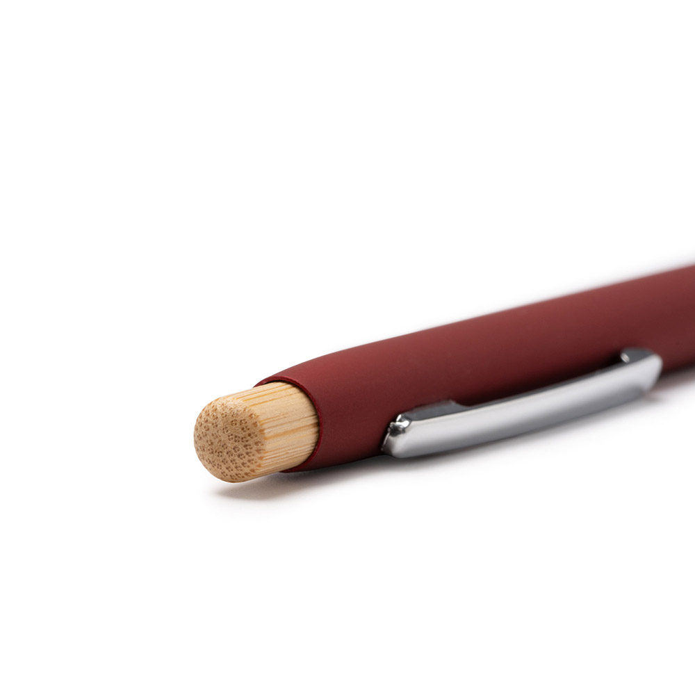 Bolígrafo métalico de acabado goma con pulsador y detalles en bambú, ofreciendo un diseño natural y sostenible. El clip cromado añade un toque de elegancia y funcionalidad. Carga jumbo de tinta azul .