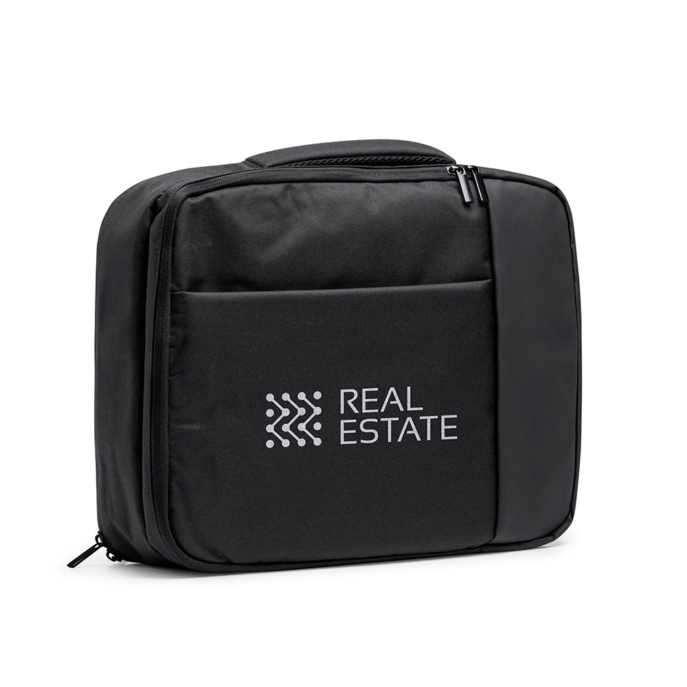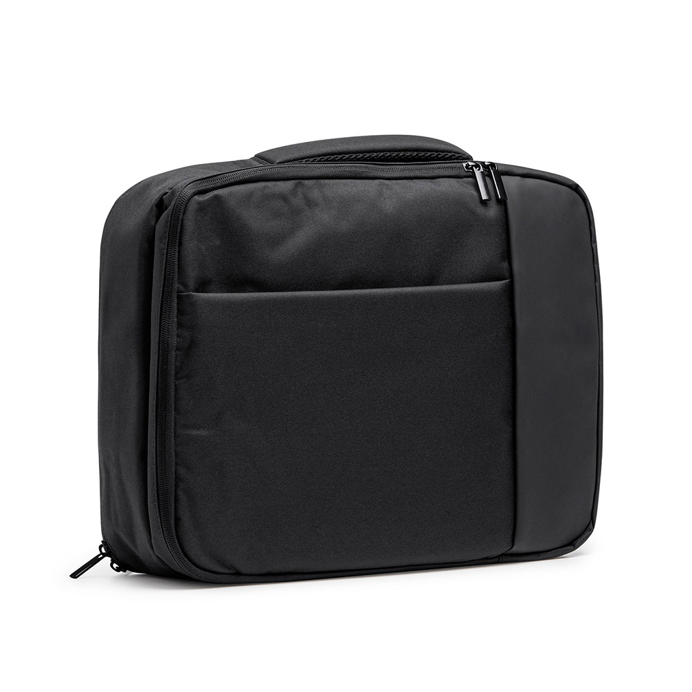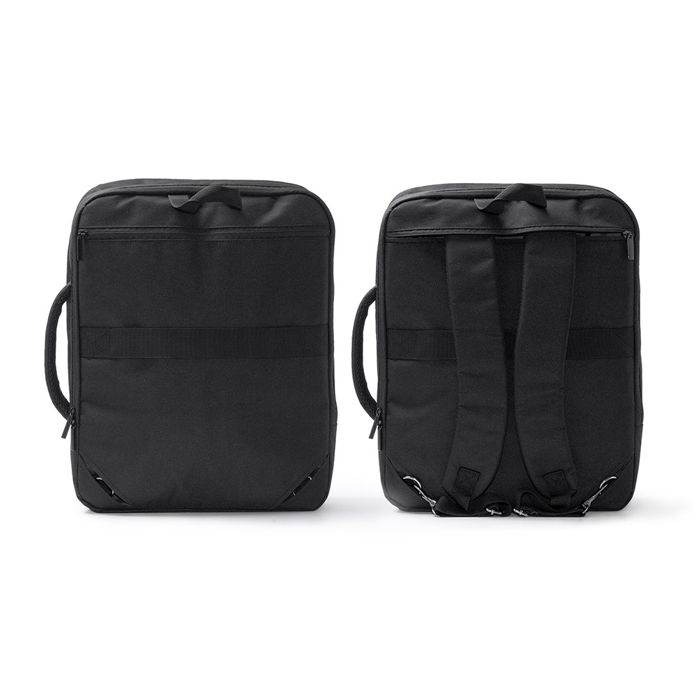 Mochila ejecutiva de viaje realizada en poliéster 300D. Dos bolsillos principales acolchados con compartimentos interiores y bolsillos ideales para portátil 15″ y Tablet. Espalda y cintas acolchadas. Bolsillo para ocultar las cintas y cinta para ajuste en trolley.