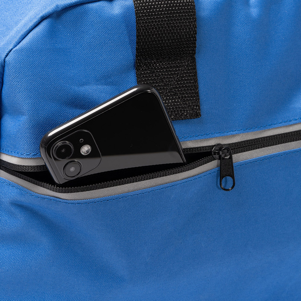 Bolso de deporte realizado en 300D RPET con cierre de cremallera y bolsillo frontal con banda reflectante. Cinta ajustable y asas reforzadas.
