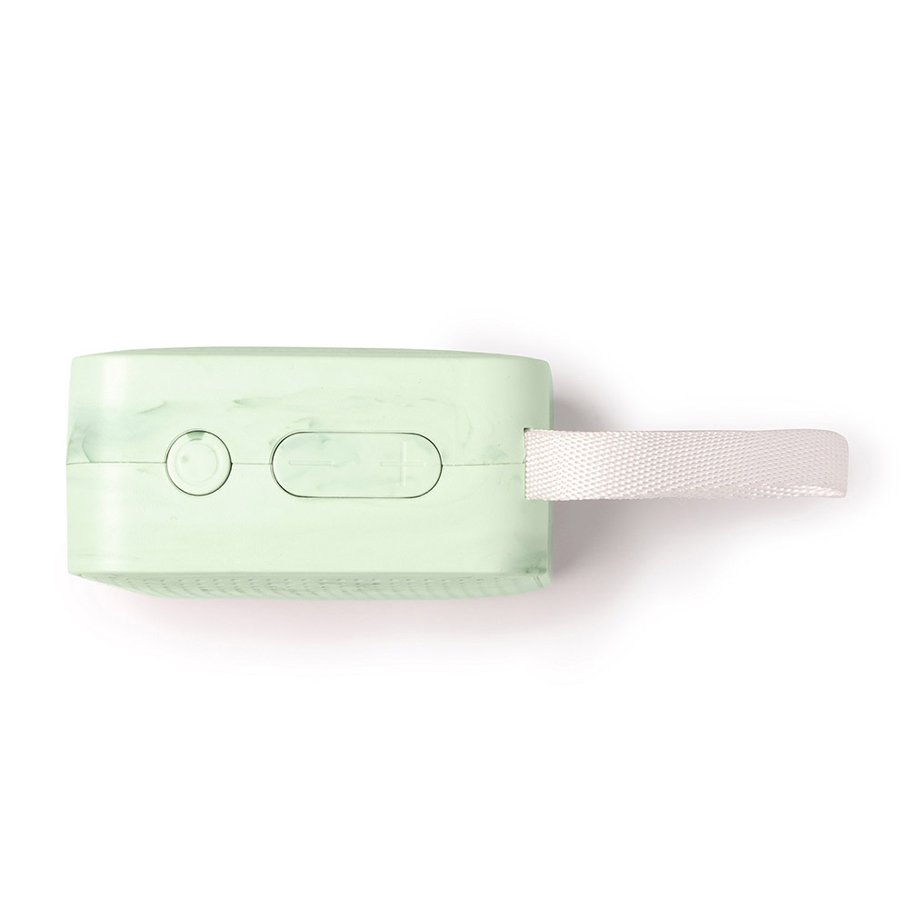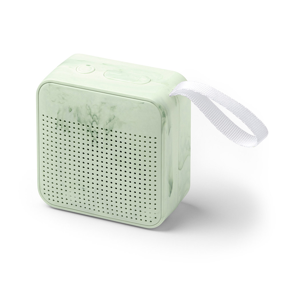 Altavoz inalámbrico recargable realizado a partir de materiales reciclados: cuerpo a partir de tapones de botella y asa de transporte en poliéster RPET.